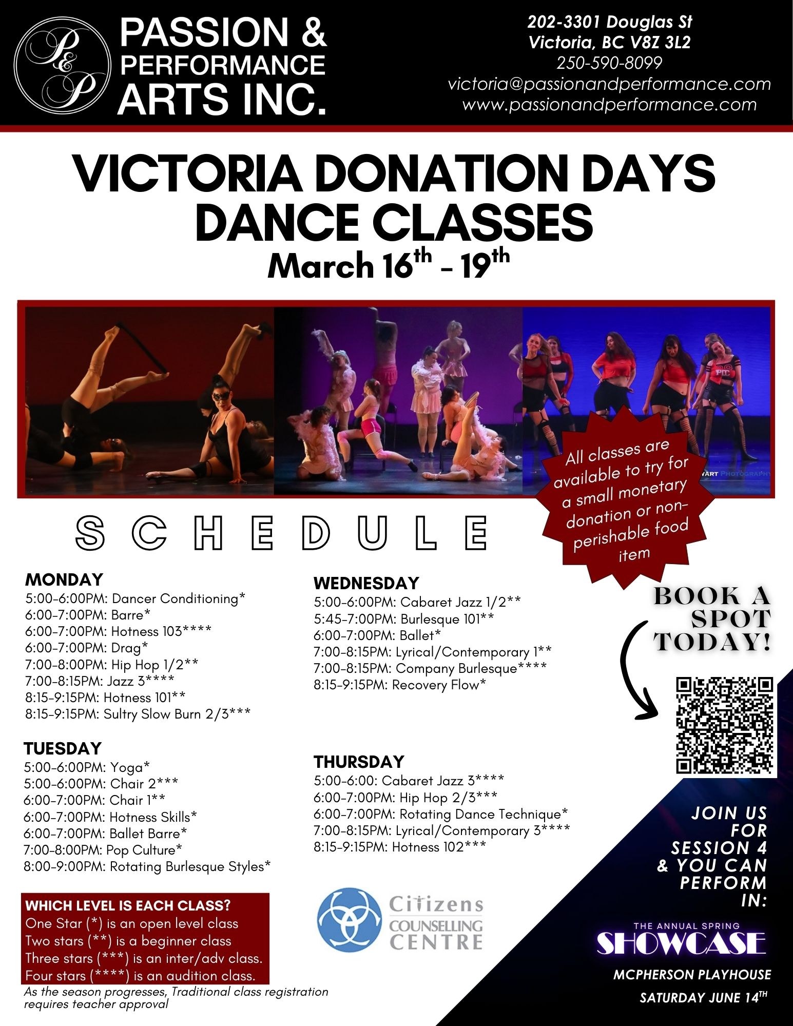 Join us March 16th – 19th for Session 4 Donation Days in Victoria! All proceeds to Citizens Counseling Centre.